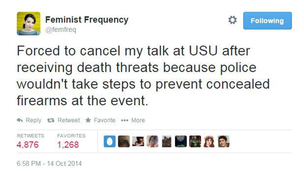 Sarkeesian has famously been the target of malicious backlash from various groups of people, notably Men's Rights Activists. Most egregiously, an anonymous male student at University of Utah threatened to bomb the school when Sarkeesian was invited to speak unless Sarkeesian's presentation was cancelled. The violent and sexist response to her critiques of video games is uncalled for and emphasizes the ongoing oppression that female activists suffer.