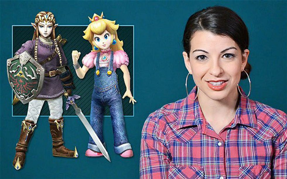 Here, Sarkeesian presents Princess Zelda ("Legend of Zelda") wearing clothing similar to what the protagonist Link wears and Princess Peach ("Mario Bros") wearing Mario-esque overalls. My response: why is it that these two can't wear their pretty princess dresses and still have depth as characters? I happen to be a huge fan of frilly dresses, and yet I manage to remain a very critical, feminist thinker with a strong personality. I am offended by this picture because it implies that these women are only valid as characters if they wear more masculinized clothing; this is femme-shaming. In fact (something Sarkeesian fails to address), "Legend of Zelda: Ocarina of Time" features Zelda in disguise as the mysterious Sheik, who is at first presumed to be a male character. Sheik guides the somewhat clueless Link throughout the game, never revealing that he is actually Zelda until the end. There is no way Link would make it through the game without Zelda's assistance. I mean... the franchise is called "Legend of Zelda," not "Legend of Link." Talk about a titular character with a lot of personality. Zelda does not need to be validated by wearing Link's clothing.Sheik/Zelda, looking badass as usual