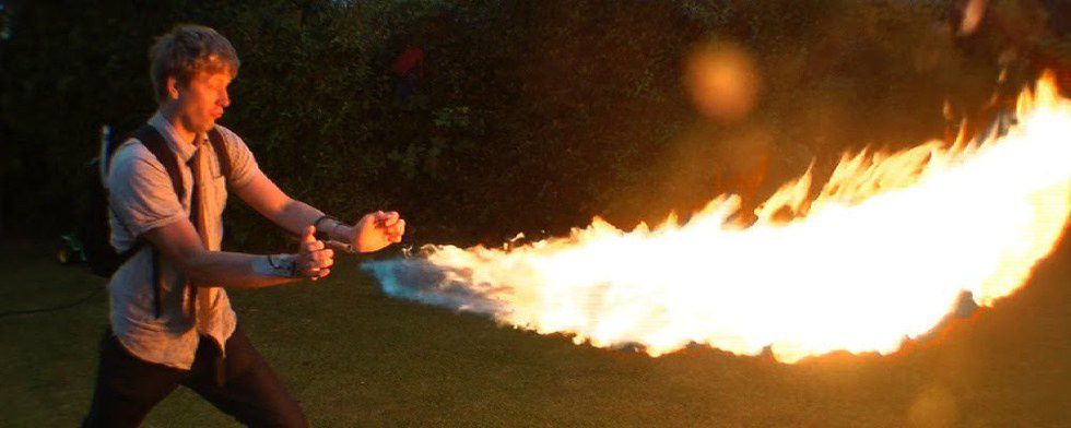 As an example of my inventions, for about 4 years in a row I made more and more effective weapons to kill the infestation of tent worms that was slowly taking over my parent's house. The first year was a rubber band powered gun that launched a stick with a ping pong ball on the end of it. It killed through blunt force, but it worked. The next year I decided I needed more power so I moved from rubber bands to springs. The springs had a larger spring constant. The next year I found that I wasn't satisfied with the springs so I went even more extreme. I made a pressurized tank attached to a quick-release valve. By pressurizing the tank (a 2 Liter Pepsi Bottle) with a tire pump, I could launch my deadly bullet (the same stick and ping pong ball, but on the other end was a cork to stick so that it acts like a cork gun). The last year, I took apart the flash portion of a camera and figured out that instead of squishing the tent worms, I could electrocute them. The 2 AA batteries would charge up a capacitor (which was audible at my age then) and simply by touching the two exposed leads to the tent worms, I could fry them! This sounds a bit twisted as I describe in in retrospect, but it got the juices flowing (no pun intended). I also made a small flame thrower with a butane refill can and a caulk gun that could shoot a 2 foot flame. It worked better than the flash portion of the camera, but it wasn't as cool as the one in the picture below.