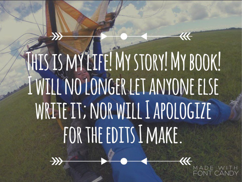 Above all else, write your own story! Don't let how others may see you and your story, keep you from writing the story you deserve! YOU are the author, YOU make the decisions, YOU and ONLY YOU have the ability, no, the power, to write the story of your life. YOU ARE IN CONTROL! If you are unhappy rewrite it! If you're scared others may not like what you write yell, "plot twist" and do it anyways! You have the right to cut them out of your story if they can't accept you. Don't apologize just do it and keep following your dreams!