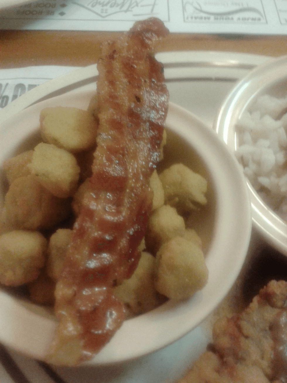 It looks just like food. However, when we look at it, we see a lunch date at Famous Amos in Jacksonville, my hometown. I was going through some serious relationship issues, and all I wanted was to be with her. I stayed with her for the night, and the next day we had this lunch date. I got country fried steak, fried okra, and something else. She got breakfast food, including bacon. I love bacon, as do most people. She gave me a piece of bacon, and I was all happy about it. No one shares their bacon with just anyone, especially when its only two or three pieces.