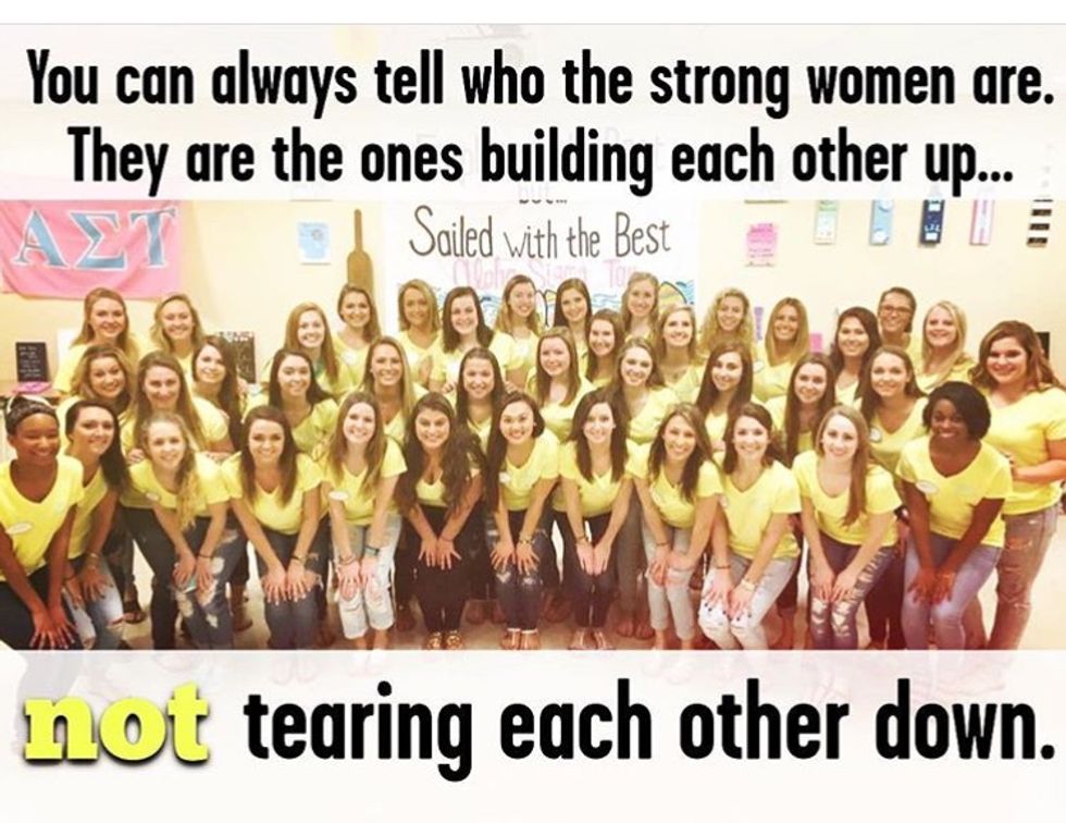 A sorority is seriously just like an extended family. There's drama and arguing, at times, but there's also constant support and shoulders to lean on. Joining a sorority forces you to learn a lot about yourself as well as the many sisters you're joining with and once you have that bond with someone, it isn't easily broken.