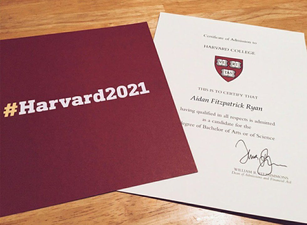 So when you ask yourself, "Why did Harvard choose me?"; remember that there are a million reasons why they chose you. You are intelligent, you are determined, you are balanced, and you are incredible. This opportunity could not have been giving to a more deserving person. Now sit back and relax (well, continue working on all those scholarships you've been applying for!) but no need to worry about the college application process anymore; you freakin' did it. Congratulations on your acceptance and enrollment in Harvard's Class of 2021, Aidan!!!