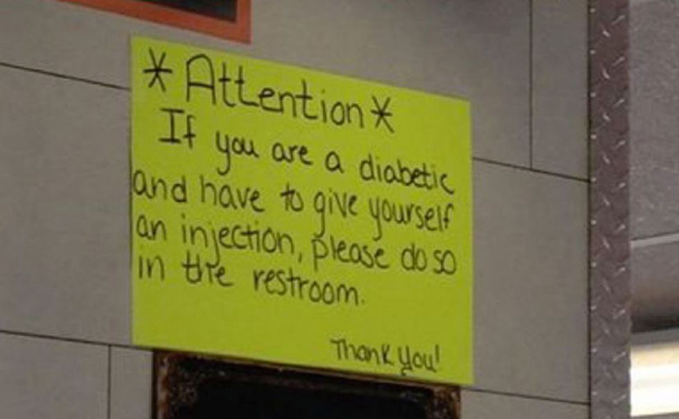 To the customer with diabetes… I am so sorry that you have to endure this situation. There is no reason for another customer to make you feel uncomfortable in any situation because of a medical condition. I am sorry that people are so inconsiderate. I am sorry that people don’t think before they speak. I am sorry that people are so uneducated now a days. Know that I am proud of you. I am proud of how strong you are. I have multiple people in my family who are diabetic and I know how difficult this may be at times. You do not deserve to feel as though this sign was directly pointed at you, so do not think that at all. You did nothing wrong.You were doing what you needed to do to survive and that is something that everyone should be able to understand easily enough. Although I don’t know you, just know that I am thinking about you. I know this situation cannot be easy for you to grasp and it is hard for even me to understand how people can be so inconsiderate. Many people look up to you. Do not let this stop you from giving yourself insulin in public; it is the other people who need to learn to deal with this, not you. Stay strong.