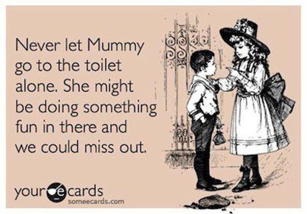I honestly can not remember the last time I went to the bathroom alone. I don't even close the door anymore because if they aren't right behind me, they'll be there within seconds to jiggle the door handle or stick their fingers under the door. If anyone knows what age toddlers realize that the bathroom isn't a portal to a different dimension let me know.