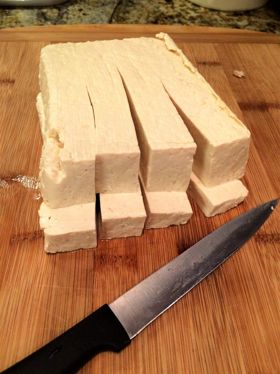 3. Then slice the tofu block 5 times across, giving you little tofu cubes.