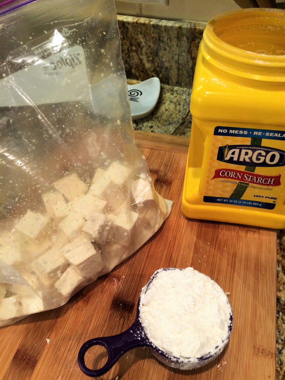 7. Pour 1/2 cup of the cornstarch into the bag. Seal and shake the bag until the tofu is evenly coated.