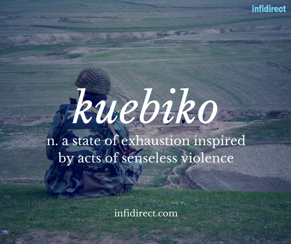 I specifically looked up Kuebiko. "n. a state of exhaustion inspired by acts of senseless violence, which force you to revise your image of what can happen in this world—mending the fences of your expectations, weeding out all unwelcome and invasive truths, cultivating the perennial good that’s buried under the surface, and propping yourself up like an old scarecrow, who’s bursting at the seams but powerless to do anything but stand there and watch".