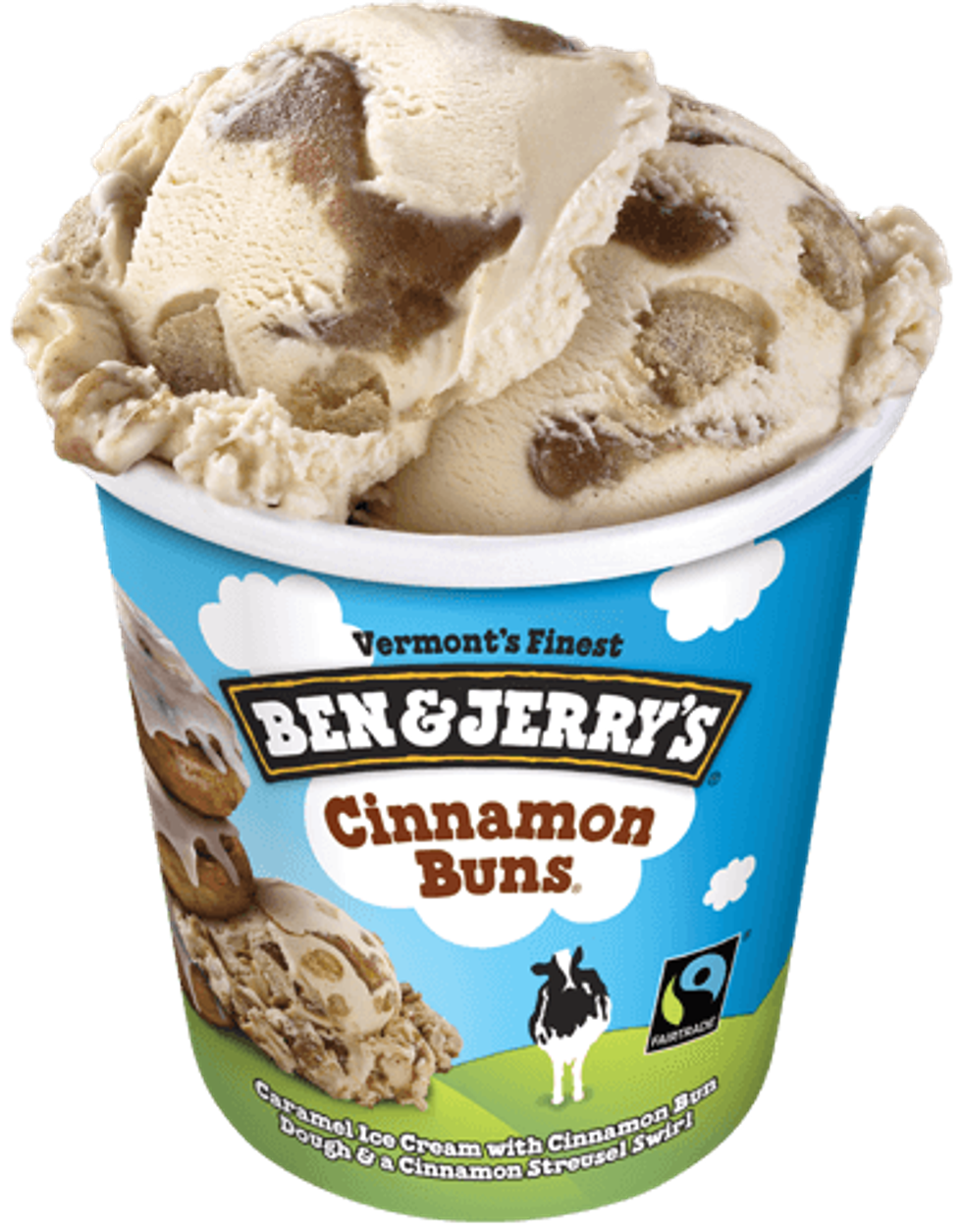 This flavor has caramel ice cream with cinnamon bun dough and cinnamon streusel mixed in.