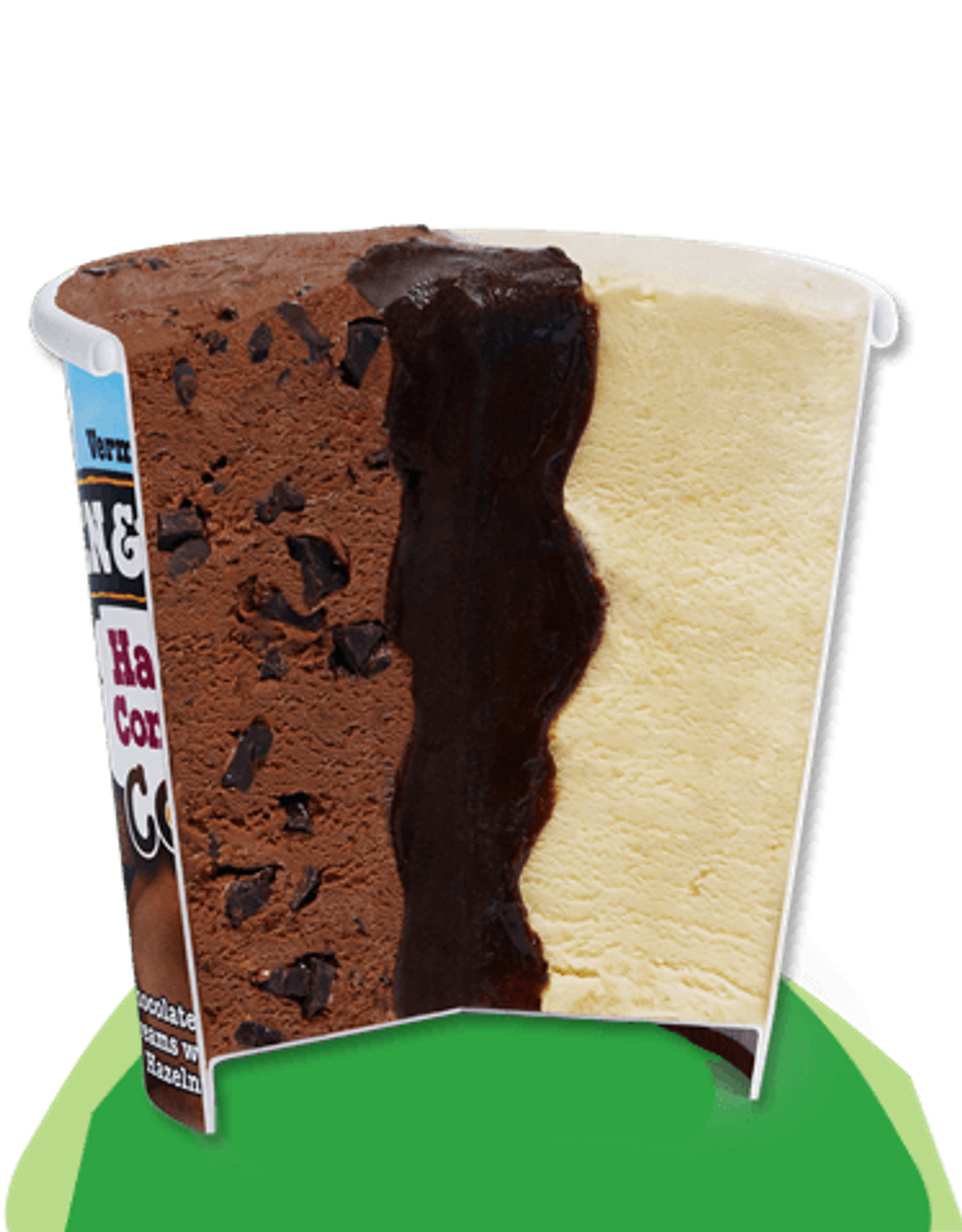 Chocolate and hazelnut ice creams with fudge chips and a hazelnut fudge core.