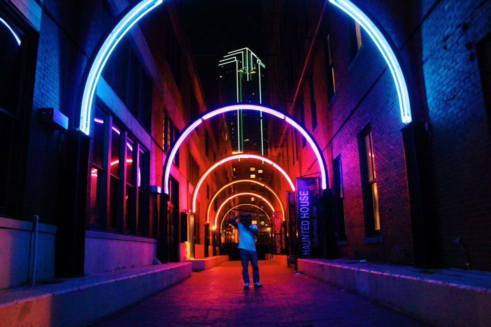 Let me start off by saying, I'm sorry. Right now this location is currently under construction. They are currently remodeling the Historic West End Market. But when the construction is over, the lights will hopefully come back. I love this area because of the florescent lighting plus the remarkable view of the Bank of America Plaza building.