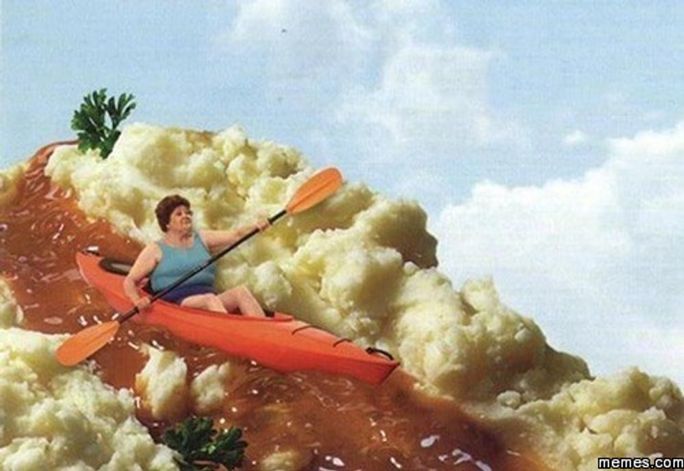 Personally, mashed potatoes are a must and I could definitely kayak through a gravy river for them.