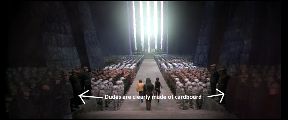 If there is one thing that has aged the most in "A New Hope" it was the matte painting used in Medal Ceremony at the end of the film. It's distracting and looks so fake that I feel like this was a sub-par effect even for the late 1970s. Even on low quality film, the faceless painted blobs that were meant to represent humans stand out too much. The digitally added human doubles blend in better and don't look as poor or distracting as the original.
