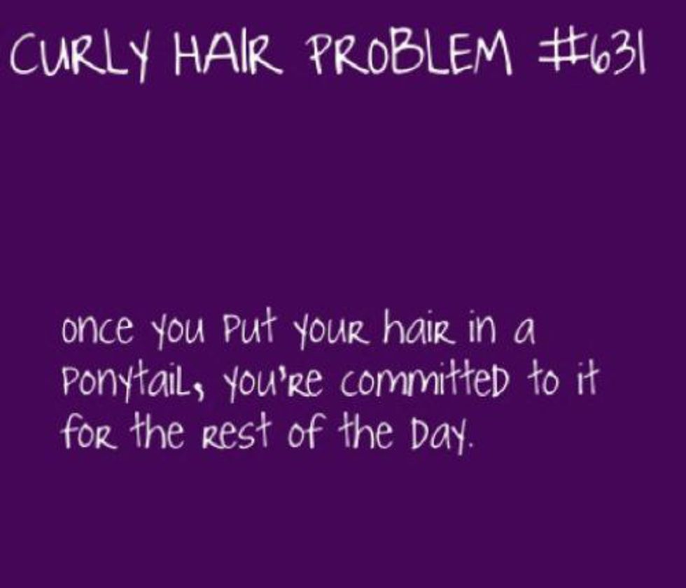 Don't even get me started on the shenanigans that curly hair tries to pull when being thrown up into a pony tail/messy bun! The first obstacle that a woman with curly hair creates for herself while throwing it up, is the fact that your hair will now succumb to being frozen in time to that exact crazy bundle of hair on your head...and there is no turning back from that. The curls become flat and crazy frizzy, and the only way to resurrect that is to wet it, de-tangle it, and start from scratch.