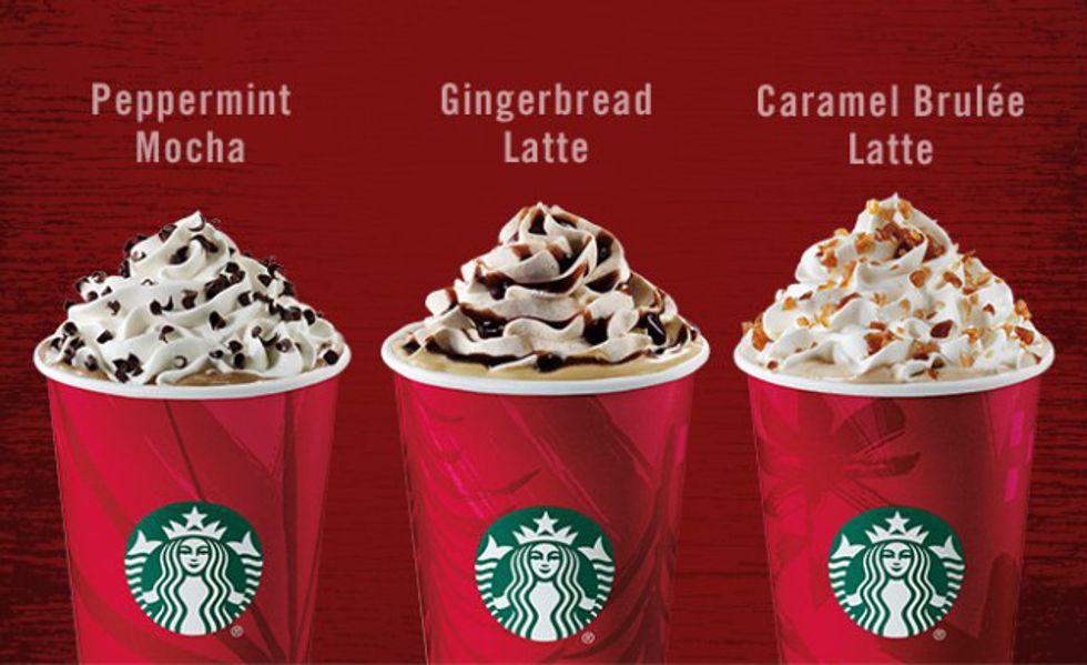 Man are these beauties festive. We have the Peppermint Mocha, Gingerbread Latte, and Caramel Brulée Latte. These hardly contain coffee, but no one needs to know what you have hidden in your classy red cup.