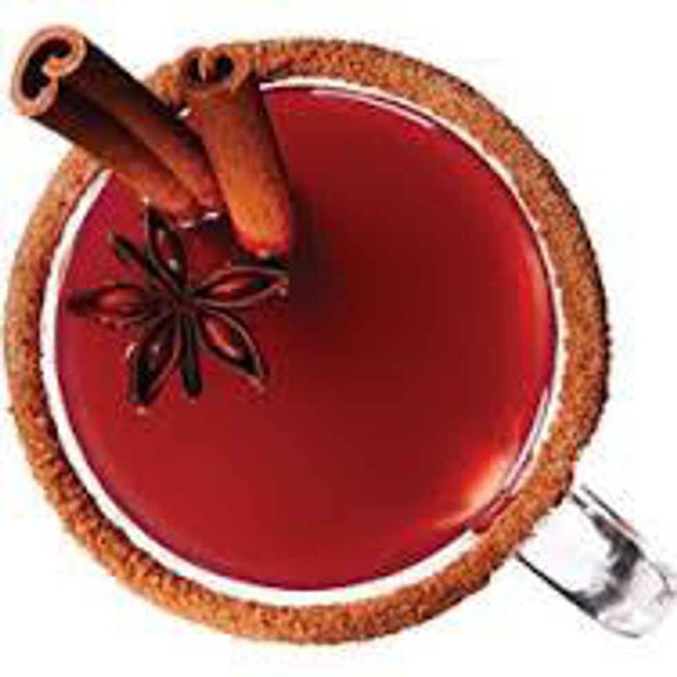 This contains hot mulled apple cider, PAMA pomegranate liqueur, cinnamon, sugar and an orange spiral if you're feeling fancy.