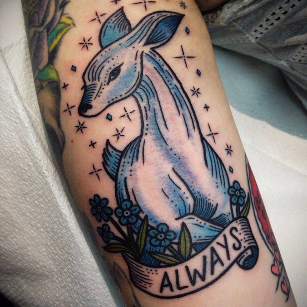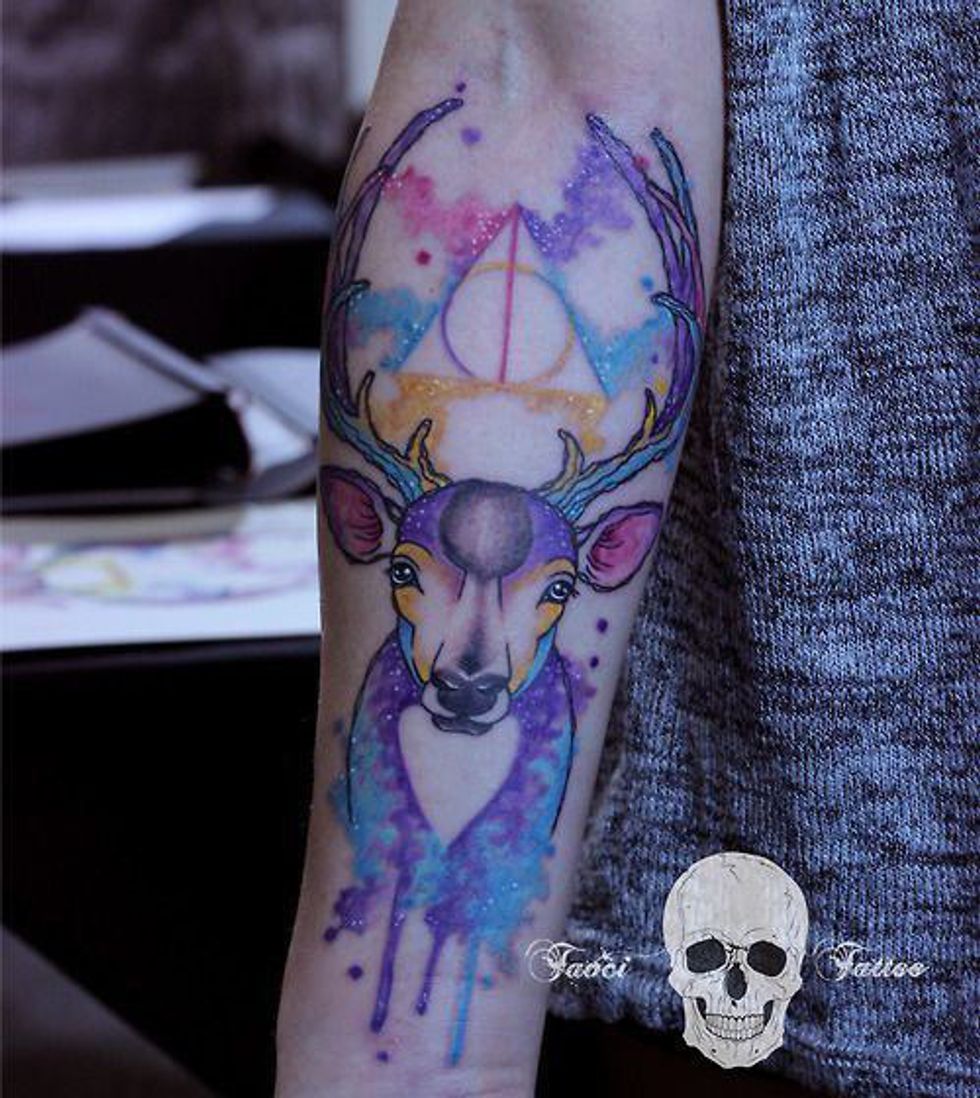 The stag is also an ultra popular choice for a Harry Potter tattoo with a lot of variance. Even though it's one animal, it can be expressed in more ways than just as a wispy blue patronus...