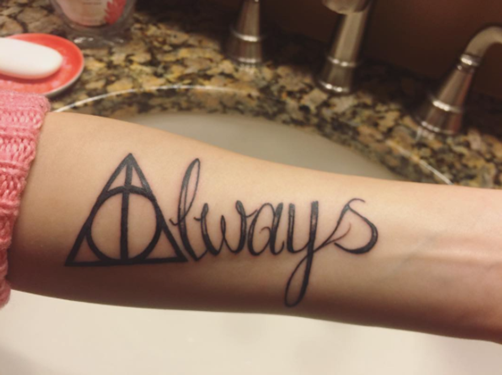 What was once an original idea for a tattoo is now the infinity tattoo of the Harry Potter community. It's overdone, cliché, and based on the worst love story of the series. For the love of Godric Gryffindor, do NOT get this tattoo.