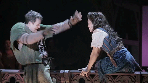 This musical begins in fifteenth-century Paris at the infamous Notre Dame. Quasimodo, the bell-ringer longs to be a part of the world but is raised to believe his deformity makes him a monster. Observing all of Paris from his tower he revels in the Feast of Fools, wandering if it could be his opportunity to get a taste of the outside world. However, the archdeacon Dom Claude Frollo, who's raised him since childhood, treats him cruelly and forbids him to leave. Despite this, Quasimodo escapes for the day and blends into the crowd, only to be treated cruelly by everyone. A beautiful young gypsy by the name of Esmeralda stands up for him causing him to develop feelings for her. But Quasimodo is not the only one who becomes entranced by her free spirit and passion. Young Captain Phoebus and even Frollo fall for her. Esmeralda refuses Frollo, befriends Quasimodo, and falls for Phoebus, Enraged by her refusal, Frollo sets out to destroy all gypsies and it is up to Quasimodo and Phoebus to save them.