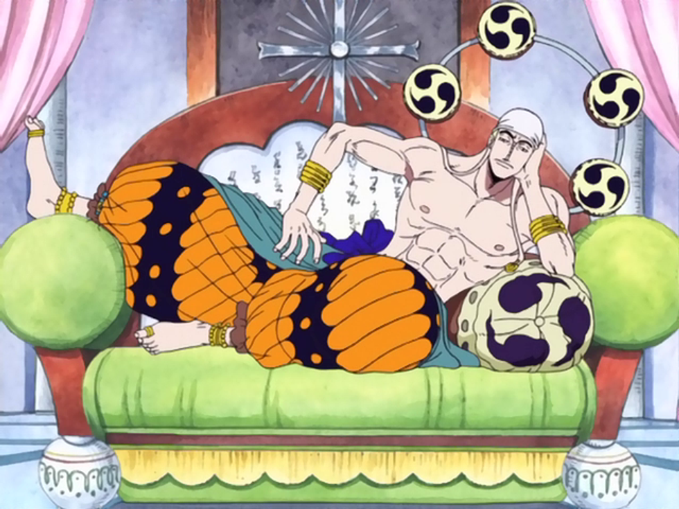 I have mixed feelings about the big bad of the Skypeia arc. His lightning power, granted to him by the Rumble Rumble Fruit, is quite possibly my favorite of the Logia class (that is, until Oda confirms that Monkey D. Dragon ate a wind-based Logia Fruit). However, it’s also extremely overpowered, even by Logia standards--Oda even wrote in a cop-out so that he would actually stand a chance against Luffy, the one and only person who could stand his strongest attack without even batting an eye or taking his pinky out of his left nostril.