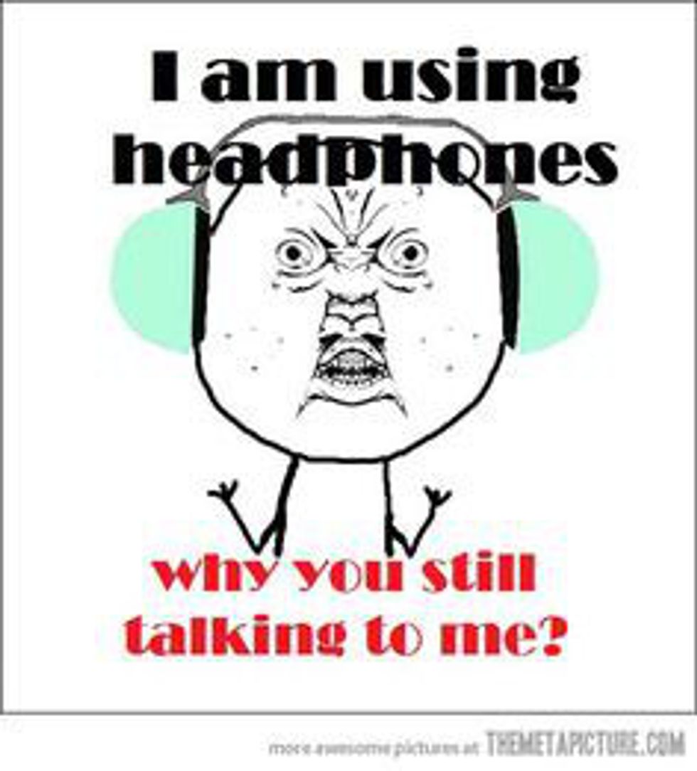 Hi, did you not see these white things in my ears that CLEARLY mean I am listening to something that is most likely far more interesting than what you have to say?! If someone has headphones in, they are literally saying DO NOT TALK TO ME. When I put headphones in for whatever reason, I have no desire to interact with people, and if you try to talk to me I'm going to be annoyed. Unless there's an emergency, if the headphones are in, shut up.