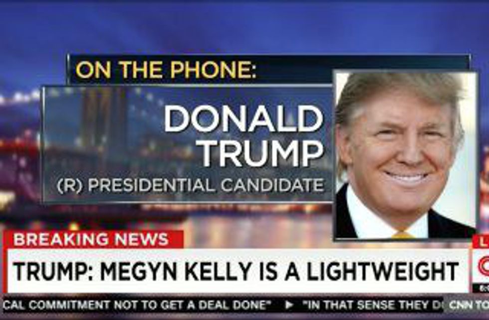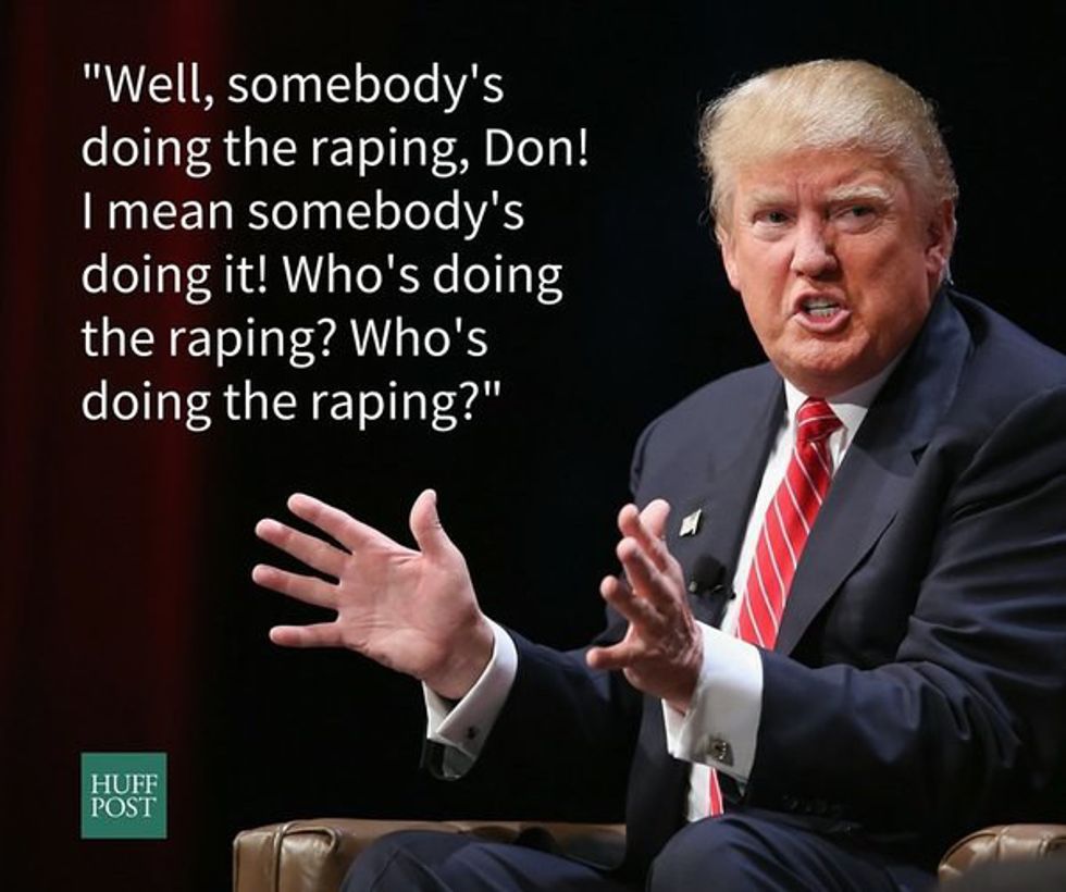 During one of the Republican Presidential Debates, Fox News correspondent and Syracuse University educated journalist, Megyn Kelly asked Trump if he had the temperament necessary to be the most powerful man in the free world, citing the candidate's own quotes calling women he disliked various horrible things. Following the debate, Trump told CNN via phone interview "she had blood coming out of her...wherever." Not-so subtly alluding to Ms. Kelly being on her period. He later tweeted, clarifying he meant blood was coming out of her nose. Because he's a grown man and periods are obviously too icky for him to allude to! Of course, you can watch the debate unfold, where there was no blood to be seen.