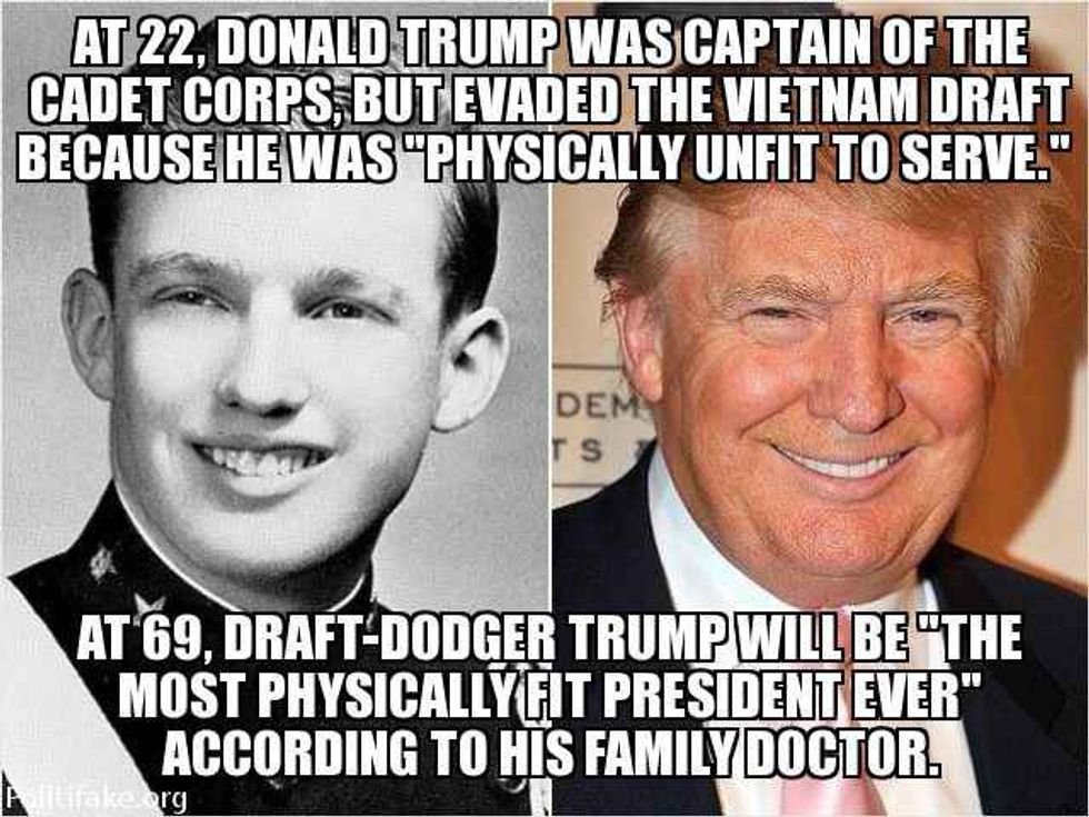 Now we're getting to some of the most disgusting and inhumane things that should bar this man from ever stepping foot near the Oval Office. Earlier this year, Trump commented that POW and U.S. Senator, John McCain was somehow less of a hero because he was captured while serving in Vietnam. This was, of course, during the same war Trump was drafted to join 5 times and still managed to avoid. This one really hits home for me, a proud Army Brat born to two dedicated United States soldiers. This man, who is now claiming he's the healthiest person to run for president, dodged the draft but still holds that his boarding school was practically equal to military training. He expressed that he does not regret his comments undermining McCain's service and sacrifice.