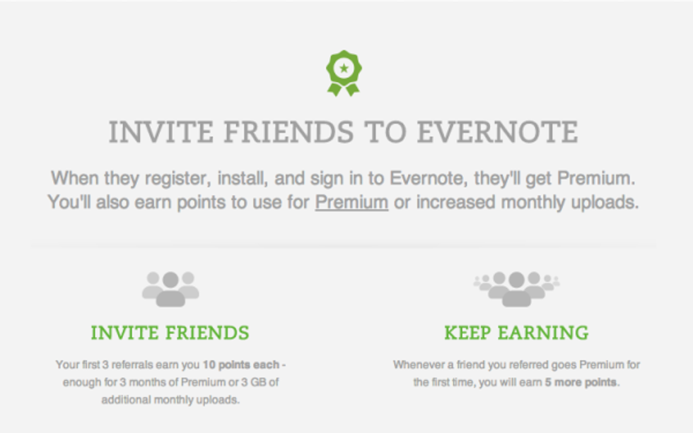 Evernote’s referral program is very much similar to Dropbox’s. Evernote has a dual-sided referral incentive program that gives people an additional space and/or Premium membership. In addition, it is simple. For you and your friend to get reward your friend has to sign in – not just sign up. Can it be made easier than this?