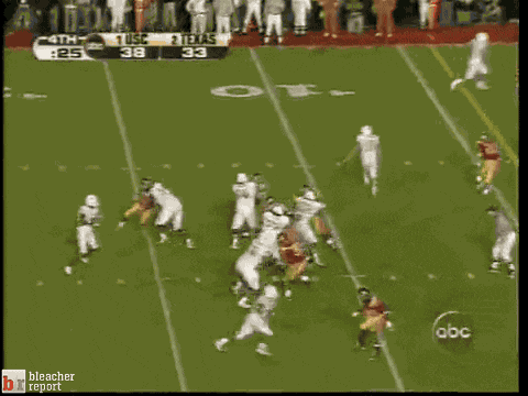 The University of Texas trailed USC 38-26 with 6:42 left to play. Vince Young accounted for all 69 yards of the drive including a 17 yard touchdown run. After the extra point Texas was only down five points. Next defensive series Texas managed to get a crucial 4th down stop to get the ball back (USC just needed a first down to continue winding down the clock). Texas kept finding ways to convert the first down despite being in long distance situations They capped off the drive with who else a Vince Young touchdown run. It was one of the single greatest performances I've ever seen. It was the first National Championship that I actually really watched and really followed through. Stayed up all night watching it with my older brother and we were living an apartment then so we had to be quiet.(rest of the family had gone to bed) There should be an award for quietest high five and cheering. Still to this day one of my top National Championships games I've ever watched.