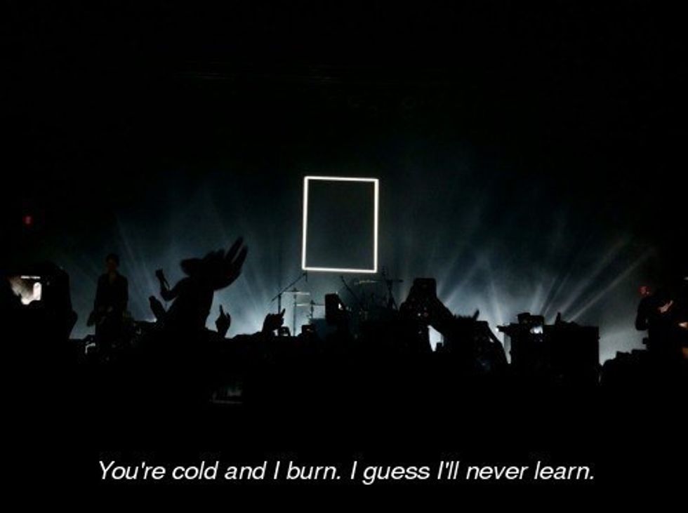 This iconic lyric is from "Settle Down." The contrast between the words "cold" and "burn" is to emphasize the differences between Matty and the girl he is singing about. Despite their crippling differences, he doesn't learn and continues to make the mistake of going back to her every time.