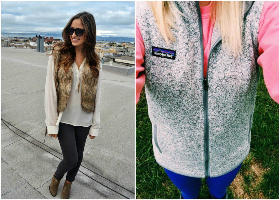 I saved vest best for last. A fur vest dresses up a cute outfit and makes it more formal, for a dinner date with friends or going out to bars. A simpler Patagonia or North Face vest worn over a t-shirt creates the illusion that you put more thought into your outfit than just rolling out of bed in what you slept in. Whichever type you prefer, a vest is an investment that you won't regret.