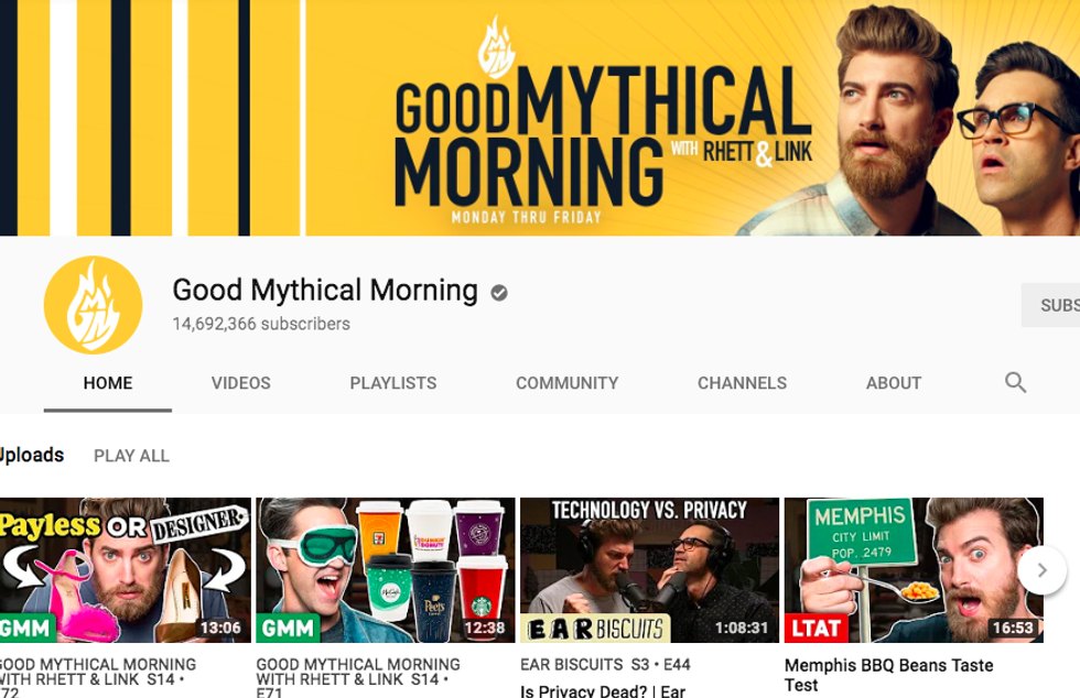 Good Mythical Morning, or GMM, is a variety/comedy show hosted by Rhett McLaughlin and Link Neal. They're famous for their "Will It" series, where they both test things like "Will It Ice Cream Sandwich?", and their generally hilarious and intuitive videos- sometimes, they even feature A-listers like Jimmy Fallon and Daniel Radcliffe. These two were one of the first Youtube channels I "religiously" watched. I'll be honest- I don't watch them as much anymore, but whenever content is lacking on the Trending page or in my other subscriptions, they are my go to for an entertaining talk show.