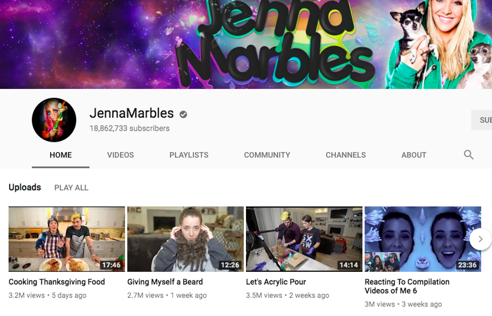 Jenna, like Shane Dawson, is one of the few Youtubers from the very beginning still left. And she is the ultimate Youtuber, with over 10 million subscribers. She, unlike many other creators, isn't addicted to ad-sense or PR or trending. She's just in her 30s, exploring her interests and hobbies, and I can only wish to be as motivated as her in doing so in my own life. Her "too-much" gene shows in her "Beau-tuber" videos while her comical side shows in her parodies and her Jenna's Ratchet Salon/cooking collaborations with Julien. She has no filter and perfectly emotes her realistic "don't care" attitude, and that's sometimes how I aspire to be. And her dogs definitely share a part of her creator-name. She's just a pure entertainer and her videos every Wednesday/Thursday give me the perfect pick me up in the middle of the week. 100/10 Would recommend.