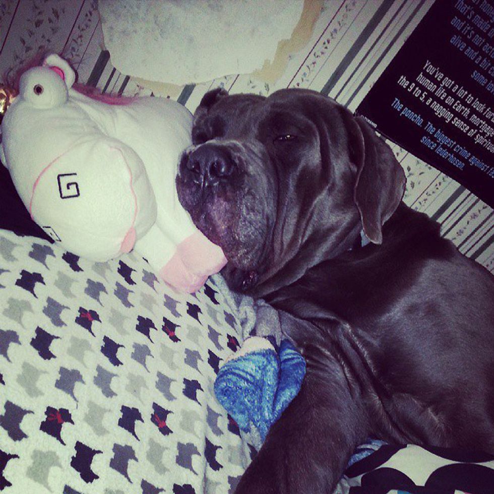 This big dope is my corso Thor. He is 165 lbs of pure love. He loves to snuggle and hog the bed to himself. He has a big old block head and he will walk right up to you and use your lap as a pillow. Many people who met him are very taken back by his size at first but I promise you, this dog will do nothing but love you. He has made my family whole again.