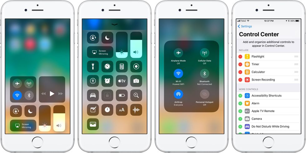 Apple completely redesigned the control center in iOS 11. Now when you swipe up, you get a page of different “Platters”. Some buttons, such as the music, the volume and brightness, can be utilized with 3D Touch (or long press) for more options. You can even customize what can go on the control center and in what order under settings.