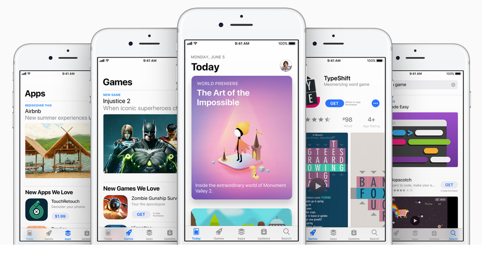 Apple, in iOS 11, redesigned the app store to give you a simpler experience. In the app store, you have different tabs: today, games, apps, updates and search. Within those tabs are visuals of apps that make it more eye appealing to the user. When you go to download or purchase an app, it provides more information in a convenient way, such as star rating, more screenshots and videos.