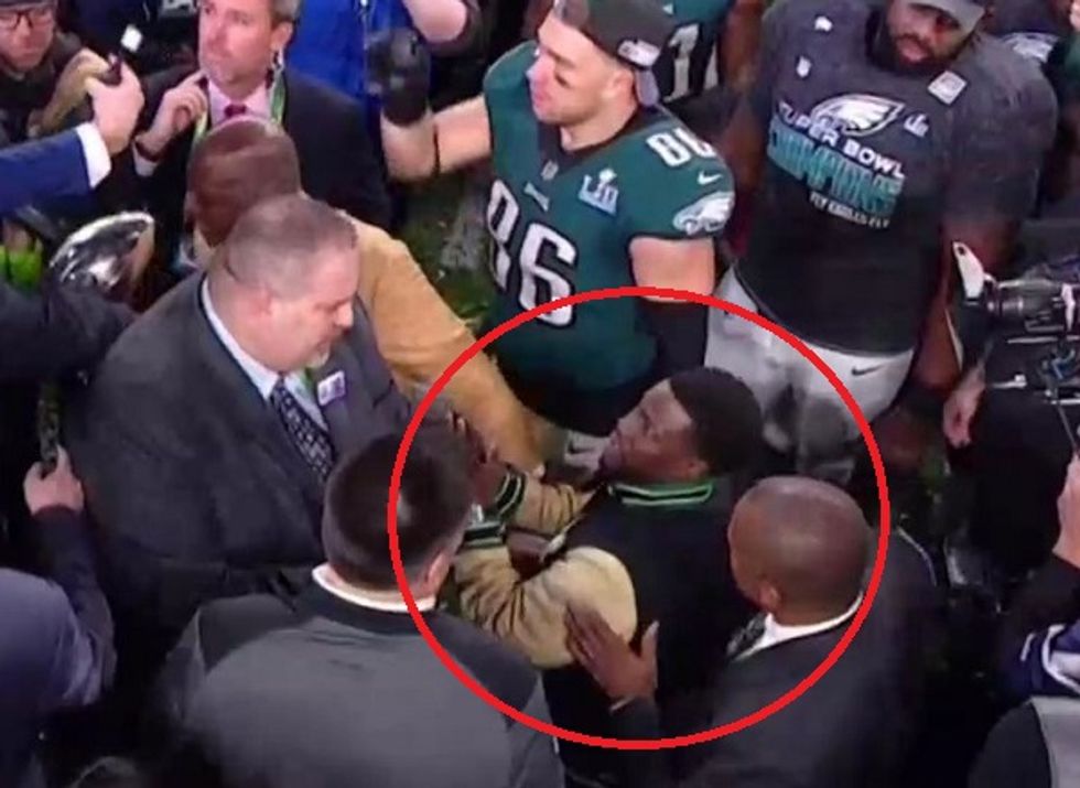 When he eventually went on stage, he dropped the F bomb when he said the Eagles won because "We gave a fuck!"