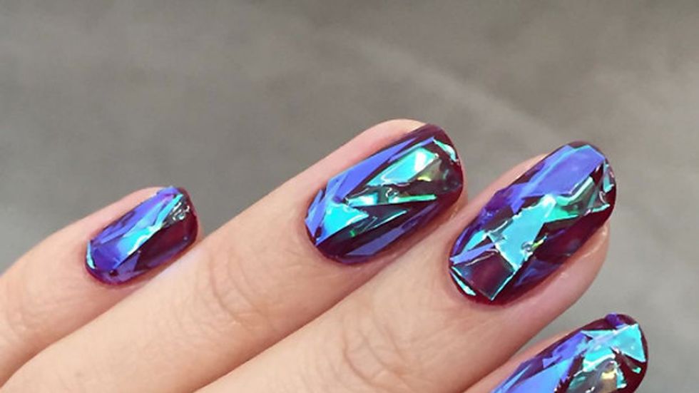 3. Shattered glass: The thought of shattered glass nails would usually make one cringe, but it's so worth it for the iridescent look.
