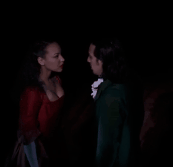 Jasmine Cephas Jones as Maria Reynolds, Leslie Odom, Jr. as Aaron Burr, Lin-Manuel Miranda as Alexander Hamilton, Sydney James Harcourt as James Reynolds, and the Original Broadway Cast of Hamilton