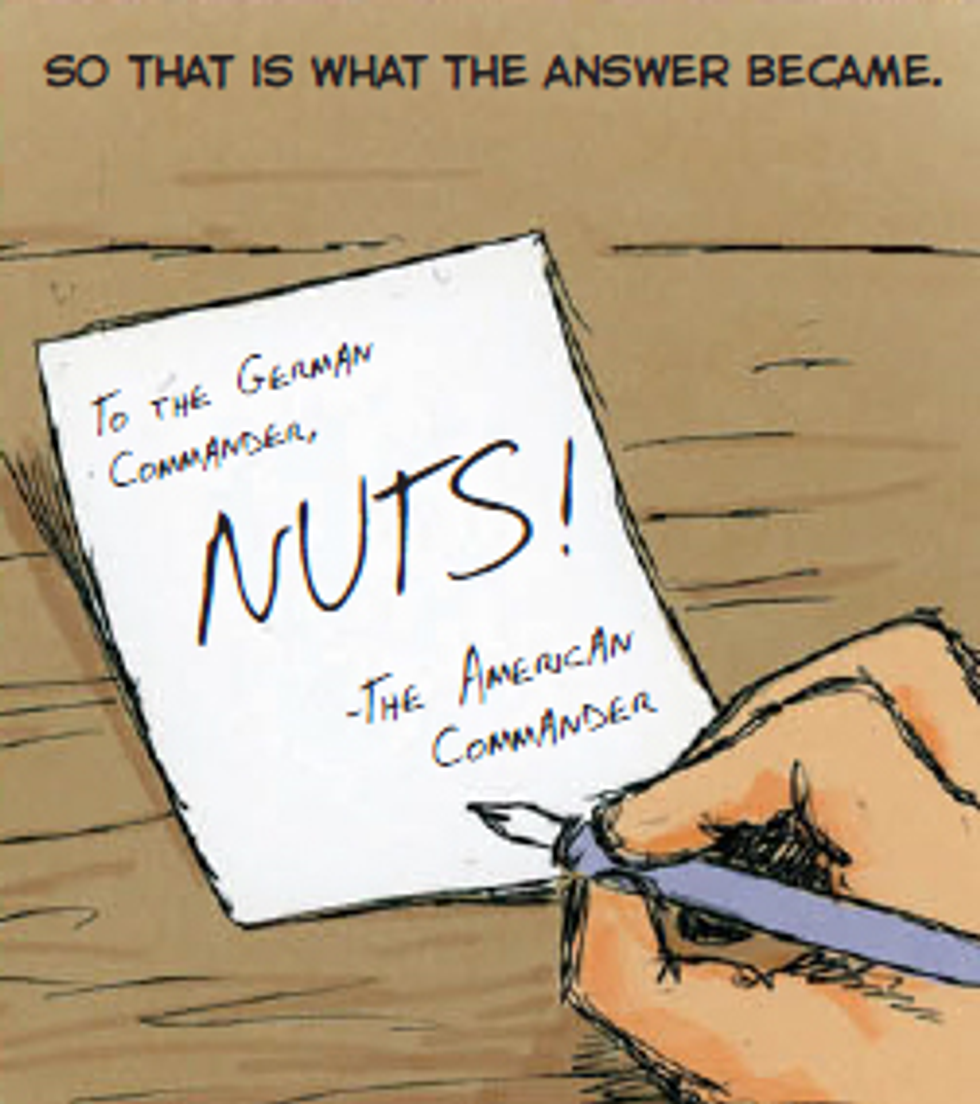This was the one word reply General McAuliffe gave to the German army forces that had surrounded the Americans at the Battle of the Bulge in Bastogne, 1944. The German commander had wrote to McAuliffe, carefully and eloquently explaining to him that he had no chance of survival if they did not surrender the town to the Nazis, which could have turned the tide of the war in favor of the Germans. The General replied with one word referencing his man regions and that must have pissed off the Germans real bad, cause they attempted to destroy the US forces, but that was the last thing they did before they all got smoke checked... Badass.