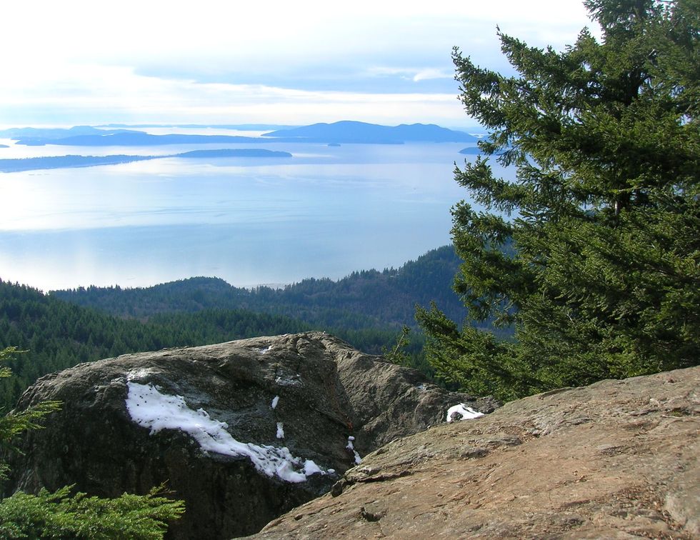 Once you reach the top, you are met with the most spectacular views in central Bellingham. To the left is Anacortes and the Skagit River flats. Lummi Island and Orcas Island are to the right. Samish Bay is straight in front and you can see Vancouver Island and the Olympic Mountains in the distance. The peak is rocky, so be careful if you hike with children or dogs.