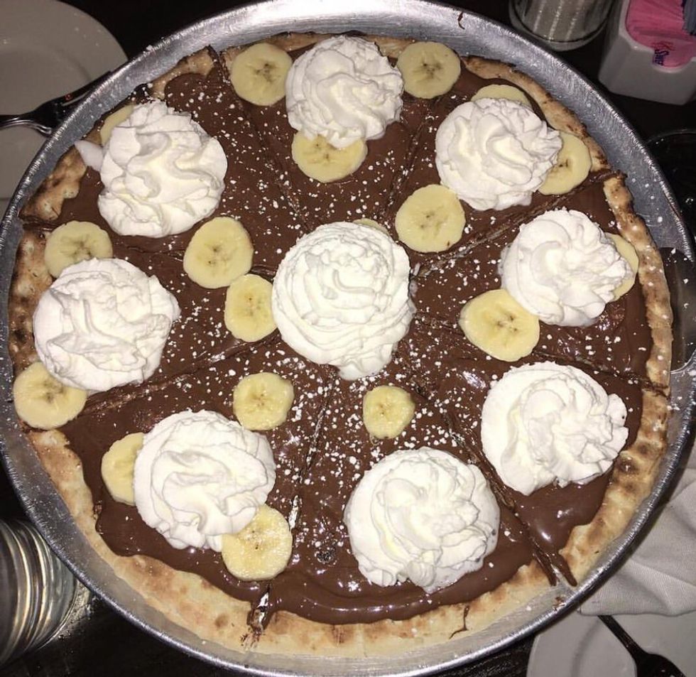 In Eltingville, Campania is serving up heaven on a plate. They call this delicious dessert Nutella pizza. They start by spreading Nutella on pizza dough, and then they top it with bananas, whipped cream, and powdered sugar. They bake it in their coal-fired oven and voila! You have the most delicious dessert you can find. Campania's coal-fired pizza has been a huge hit on Staten Island, and if you've ever tasted it, you would know why. I can assure you that this Nutella pizza is just as amazing as their coal-fired pies.