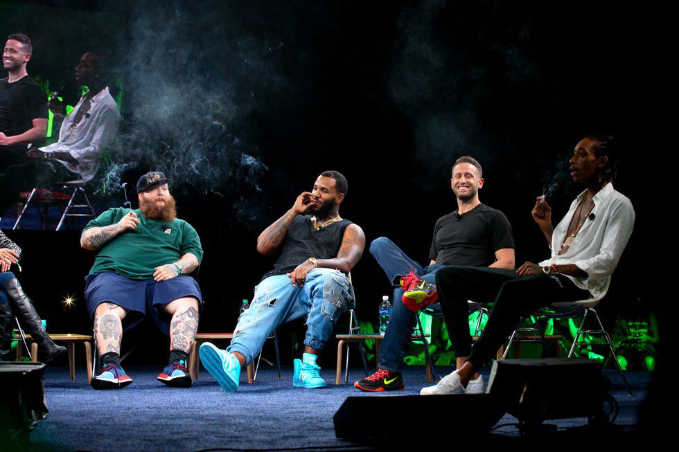 Action Bronson, Wiz Khalifa, and The Game Smoking Weed during a talk-panel about weed.
