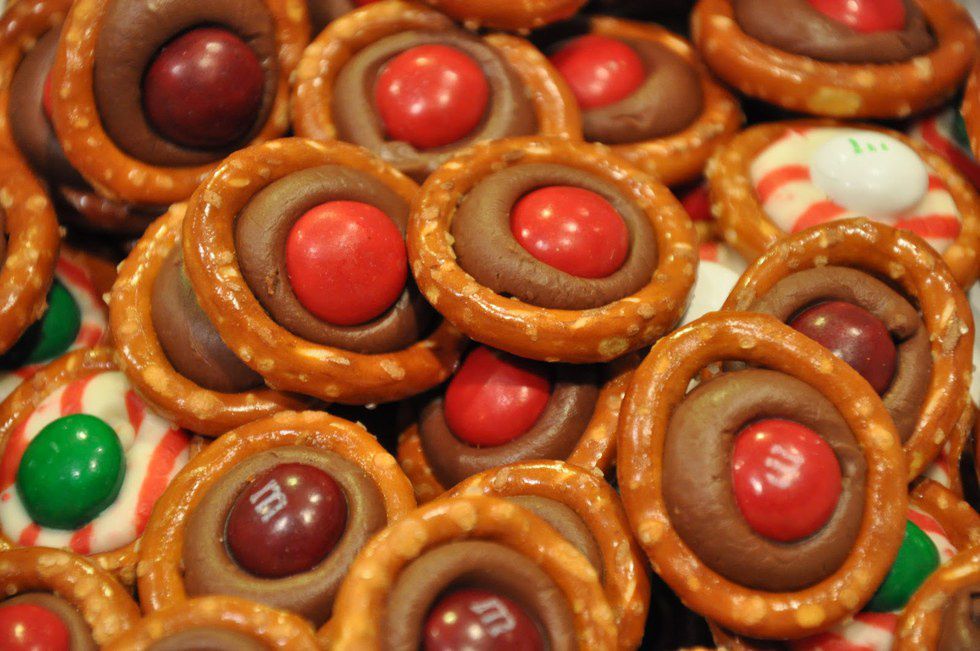 Okay, these are so easy a kid could do them; all you need are pretzels (I like the Snyder's Snaps the best for this), Hershey's Kisses, and M&M's to make these tasty treats. These are a huge hit with both children and adults, and are the quickest and easiest thing to make for any party you may be going to -- plus they're easy to travel with!