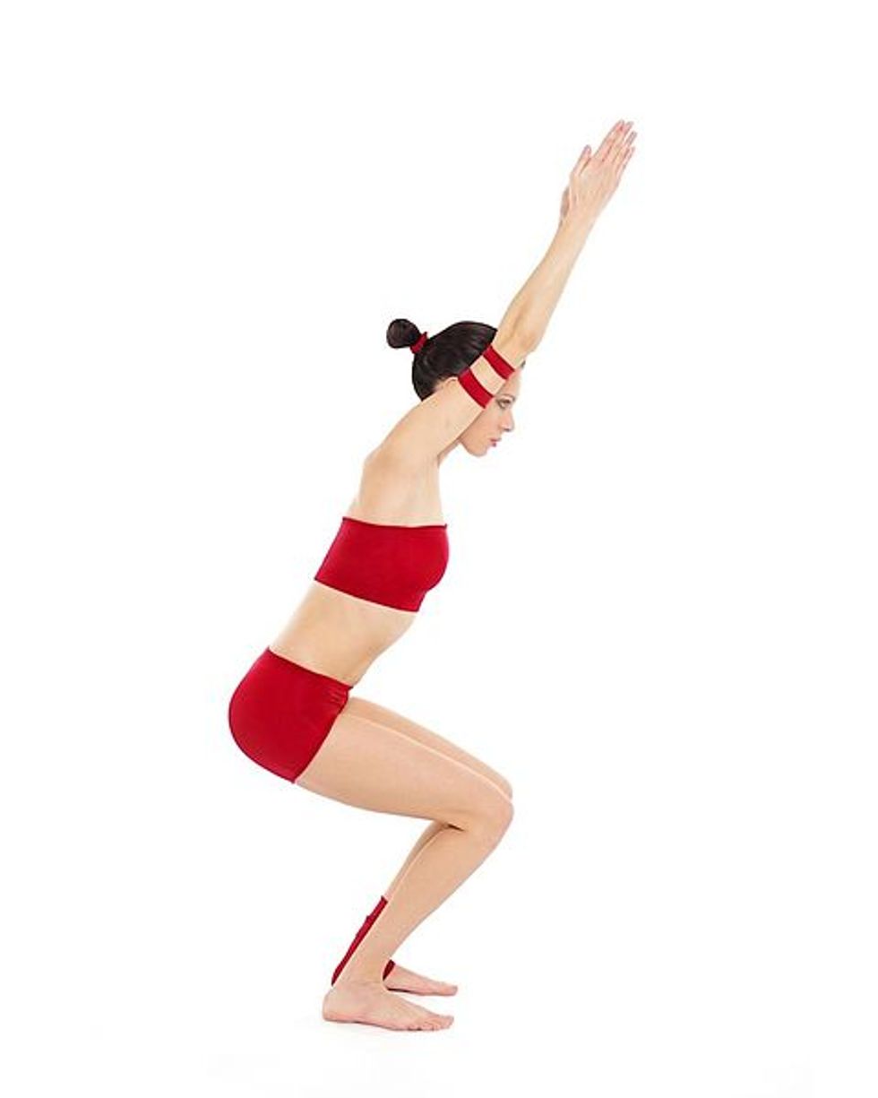This move appears to be a simple standing position, but it adds the difficulty of balancing. To perform this, you must stand in an upright position with your feet together and arms tightly at your side. Then imagine that you are sitting down in a chair, but you must keep your back parallel with the rest of your body. Once you are comfortably in this position, raise your arms up to the ceiling and hold.