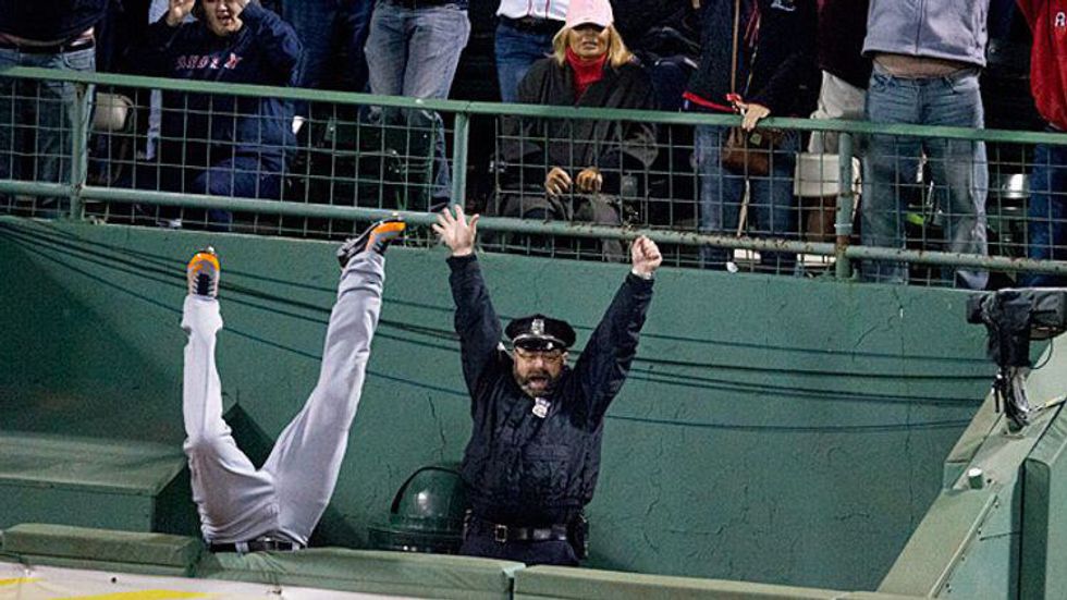 Down 5-1 in the bottom of the 8th inning at Fenway Park in game two of the American League Championship game. Bases loaded. Papi steps into the batters' box. One pitch was all he needed. Detriot Tiger's Joaquin Benoit threw a cutter that hung right over the middle of the plate that Ortiz tattooed into the Red Sox bullpen in right field. With his four-run-blast, Papi tied the game and gave the Red Sox the momentum they needed to tie the series 1-1. His shot over the right field wall not only brought the team back but also produced one of the most recognizable images in recent Red Sox history.