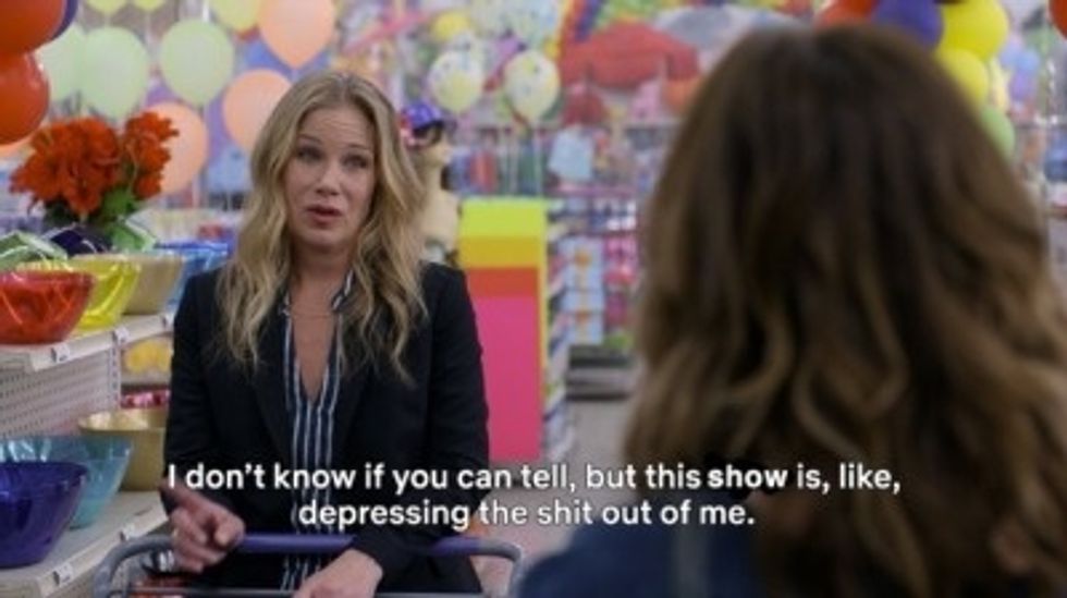Dead to Me is a dark comedy that explores the oddly funny side of grief and forgiveness. Jen's, Christina Applegate's character, husband died in a tragic hit and run.