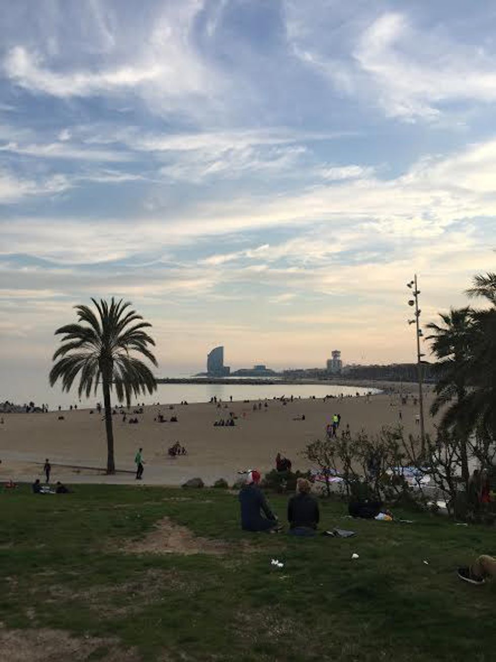 Luckily, we had amazing spring weather and blue skies when my friend and I visited, but after talking with other travelers to Barcelona, it seems this city is always under the presence of warm weather. We took time at the end of the day to make our way to the coast and dip our feet in the Mediterranean Sea, which, to our disappointment, was chilly. After putting our feet in the water, we made our way to the strip of rocks jutting out into the sea to sit and watch the sunset, but we were soon approached by vendors selling young coconut meat in a very unsanitary looking bucket. We refused his offers, knowing full well if we happened to take a piece there would be a price attached. The rocks were mostly empty with the exception of some trendy Spanish teenagers conducting a photo shoot (they enthusiastically took a picture of my friend and I, too) and a small group of Americans who were carrying five bottles of wine. We soon saw a booze cruise pull up that unloaded a large group of drunk American students who proceeded to pee on the palm trees lining the beach to the dismay of many other beach-goers. With so many people at the beach, most of whom are drinking or purchasing items from street vendors, it is a pick pocketer’s paradise. At our tour the following day, we were chatting with another visiting American who had her phone stolen out of her shoe at the beach. I have heard about many other unfortunate incidents like this, and I think my friend and I managed to avoid a similar event at the beach by sitting far out on the rocks. Besides the presence of pick-pocketers, the beach is beautiful and you can see the mountains out past the city and have a drink at one of the stylish bars lining the strip.