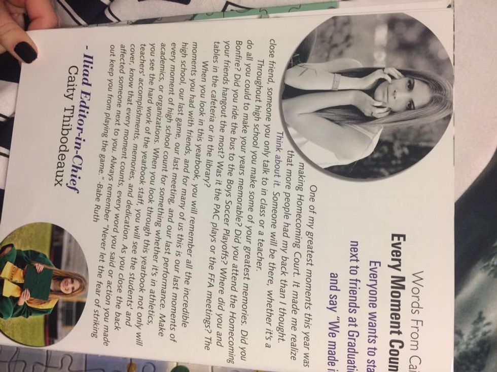 Signing up to be in the yearbook class my junior year was one of the most scariest things I did in high school. I had absolutely no idea what to expect, but I'm glad I stuck to it. The yearbook helped me find what I want to do for the rest of my life. I am now ending sophomore year of college continuing my major in Journalism. Being Editor and Chief makes my list of Top 3 greatest accomplishments in high school along with getting an FFA scholarship and making a 3.2 GPA. My yearbook advisors helped sculpt me into who I am and for them I am forever grateful. They continue to have open arms every chance I get to see them, supporting me on my journey.