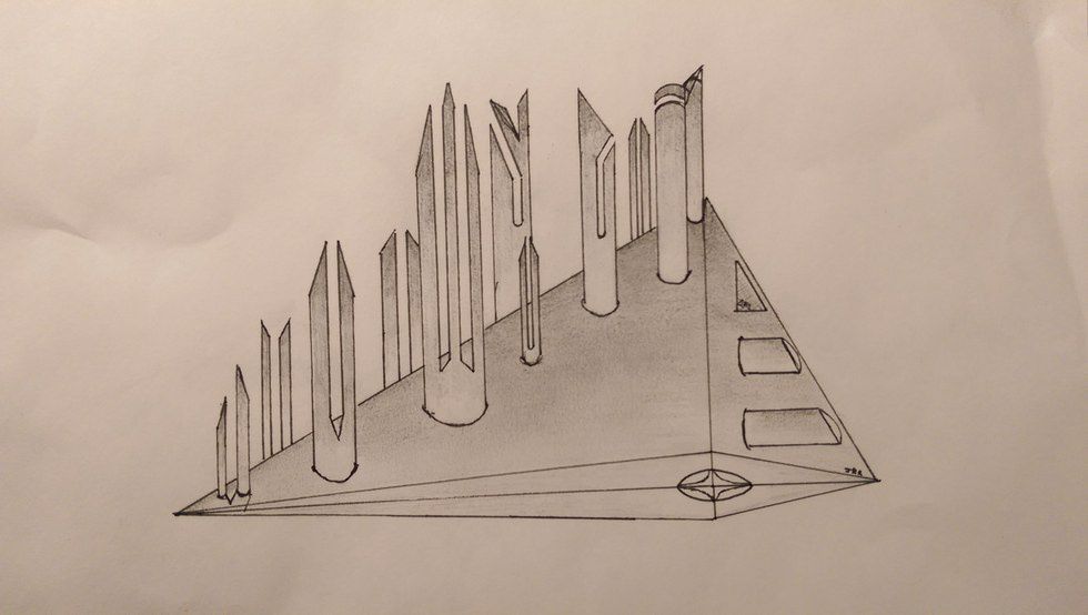The target of this drawing was for me to start off with a simple abstract shape (the diamond shape of the larger body). Then I decided to add pillars that are similar to buildings emerging out of the shape. At the time I recently saw an ad for an old animated series returning called "Samurai Jack". In the background of the ad, there were sharp silhouettes of buildings. Those buildings were the main influence of the drawing. The underside of the ship has some sort of symbol that I imagine glowing. Finally, the backside of the "ship" has three additional pillars that resemble ship engine "thrusters".